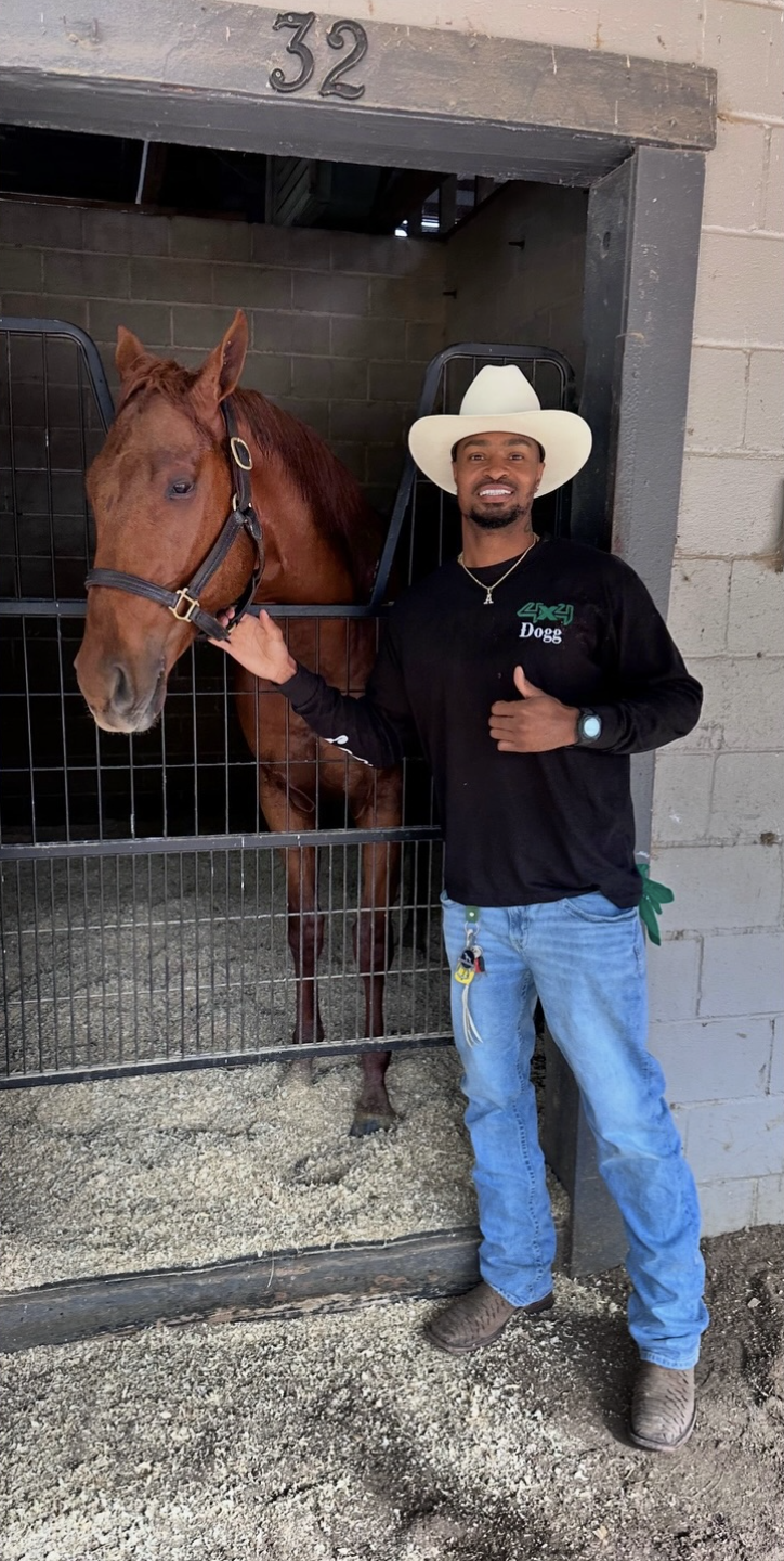 Hall started his April 8 morning not on the rubber track that carried him to world fame when winning the 2024 Olympics men's 400-meter event in Paris, but standing alongside the dirt track watching Thoroughbred racehorses train at Travis Durr Training Center in St. Matthews, S.C.